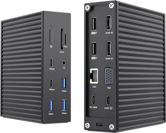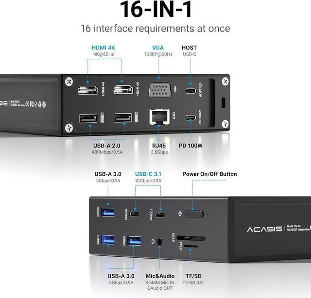 Laptop Docking Station Dual Monitor: This 16-in-1 usb c hub easily expands your laptop into a 16-port workstation, with 2*4K HDMI, 1080P VGA, 2*10Gbps USB C 3.1, 3*5Gbps USB A 3.0, 2*USB A 2.0, SD/TF card reader, 2.5Gbps RJ45 Ethernet,3.5mm audio and microphone, and PD 100W charging
