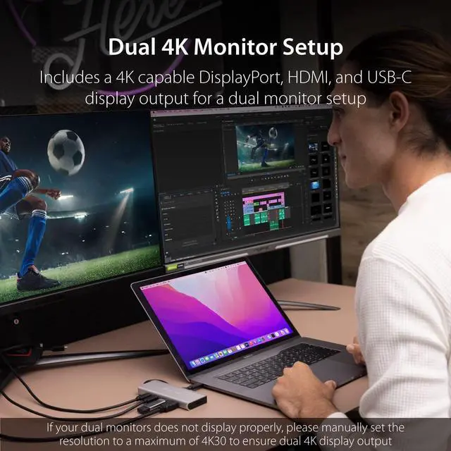 Dual 4K Monitor Setup Includes a 4K capable DisplayPort, HDMI, and USB-C display output for a dual monitor setup. Thunderbolt 3 | 4 compatible and no driver installation is needed. Supports extended desktop mode on macOS and Windows. *Dual display not supported on certain Apple M1 or M2 Macs. Contact your computer manufacturer to verify compatibility.