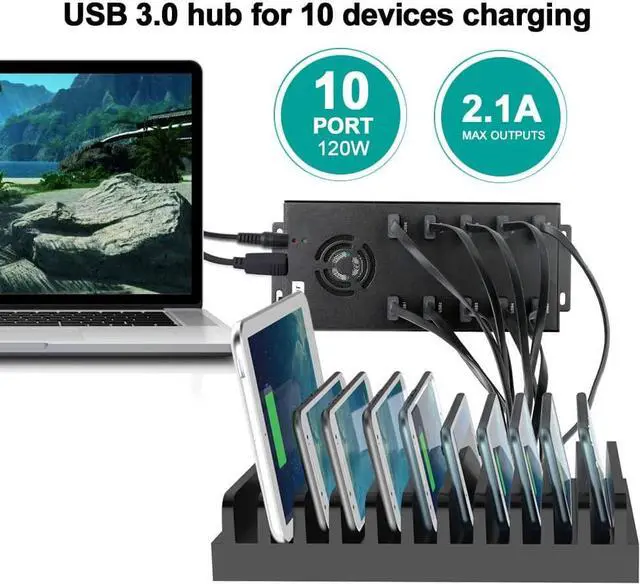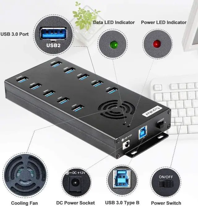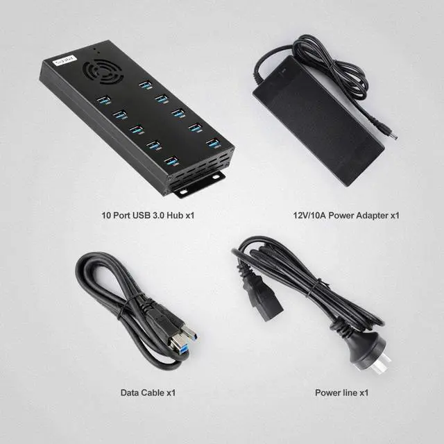 Safe Use- Powered multi port USB Hub built-in cooling fan prevents overheating, current protection function, support overload voltage and instantaneous current protection function. Keeps your deveices and data safe and supports hot swapping. External power supply ensures multiple devices work simultaneously. Comes with a 12V 10A power adapter, charge speeds up to 5V/2.1A for each port