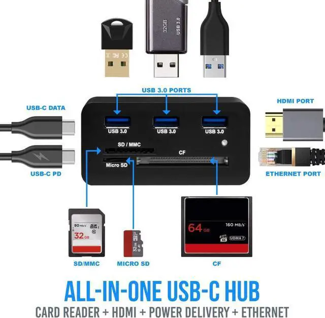 Loaded Support - this multi-functional card reader supports high speed , micro, sd, ehternet, 4k hdmi, 60w pdreader, and cf card reading. switch between either card support and have the utility and power in 1 item.