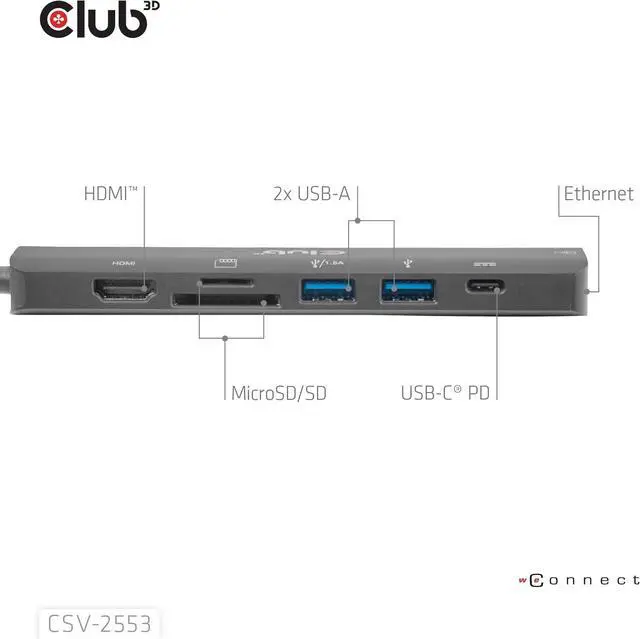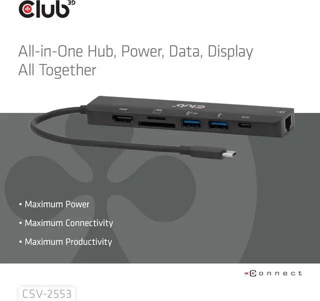 Club3D CSV-2553 7-in-1 USB C Hub => HDMI4K60Hz/SD-TF, 2x USB A/USB C PD/RJ45