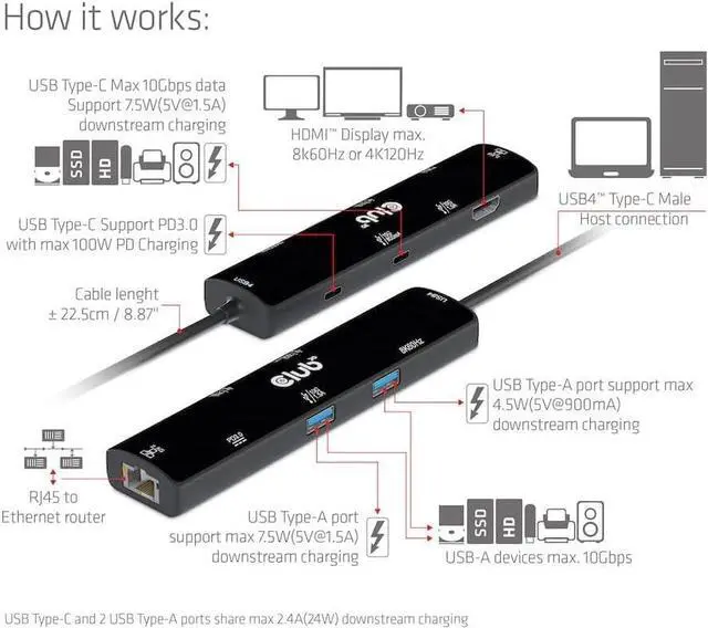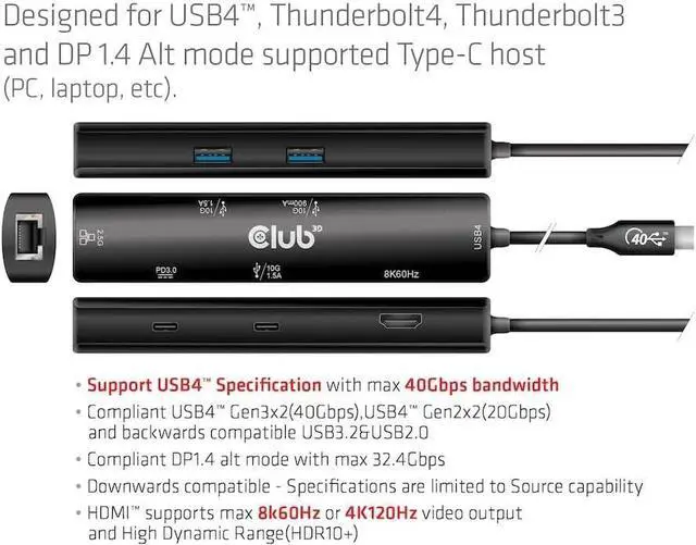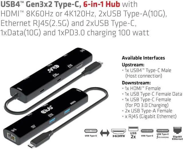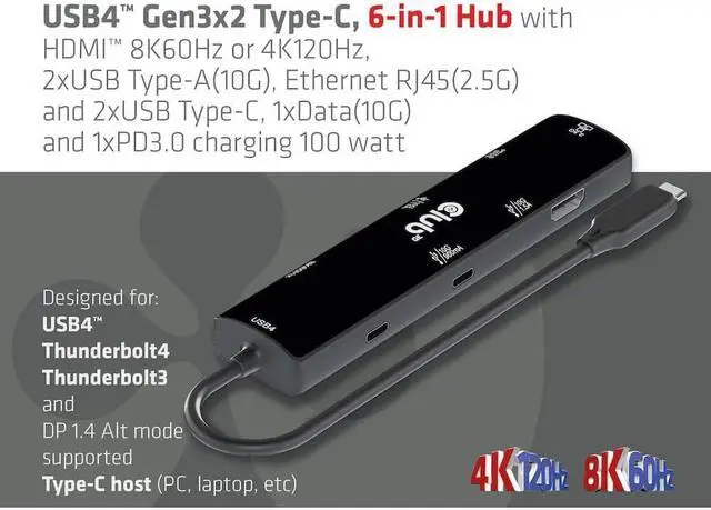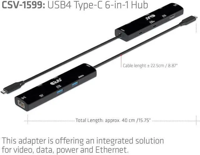 Club 3D CSV-1599 is a 6-in-1 hub, including USB4 Gen3x2 Type-C, HDMI 8K60Hz or 4K120Hz, 2 USB Type-A(10G), Ethernet RJ45(2.5G) and 2 USB Type-C, 1x Data(10G) and 1x PD3.0 charging 100 watts". Ethernet Integration solutions