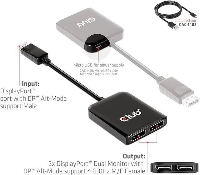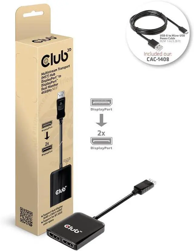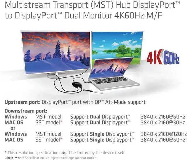 The CSV-7200 is a DP1.4 Alt Mode to DisplayPort Dual Monitor 4K60Hz M/B. MST Hub This DisplayPort MST hub is designed to meet your diverse connection requirements, e.g. with tablet, laptop etc. with a DisplayPort1.4 output of DP1.4 Alt Mode supported. Use more displays with your Ultrabook. Ultrabooks and notebooks are increasingly powerful, but at the same time more compact in their design. With a single available DisplayPort output, you can now power one or two DisplayPort displays simultaneously at 4K60Hz or one display at 4K120Hz. All you need is a free DisplayPort output with DP1.4 Alt-Mode on your laptop or ultrabook to connect the MST Hub and this will provide unprecedented connectivity options for connecting dual 4K60Hz displays. Setup is easy to set up, provided your system supports this feature.