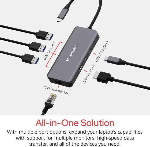 Transform a single USB-C port into six versatile ports to connect a wide range of devices: 1 x HDMI, up to 4K@30Hz, 3 x USB-A 3.2 Gen1, up to 5Gb/s, 1 x USB-C PD, up to 100W, 1 x RJ45