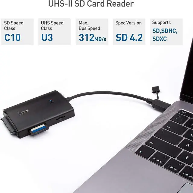 UHS-II SD CARD READER supports an SD card, SDHC memory card, and SDXC memory card; A UHS II card reader transfers files 2.5 times faster than a UHS I card reader; USB C card reader is backwards compatible with a UHS-I cards such as a micro SD card reader with an adapter; USB C to SATA adapter is compatible with popular UHS II SD cards such as the Lexar Professional 32GB SDHC UHS-II, Sony SF-G64/T1 64GB SDXC, Sony SF-G128 SDXC UHS-II, SanDisk Extreme Pro 64GB SDXC UHS-II