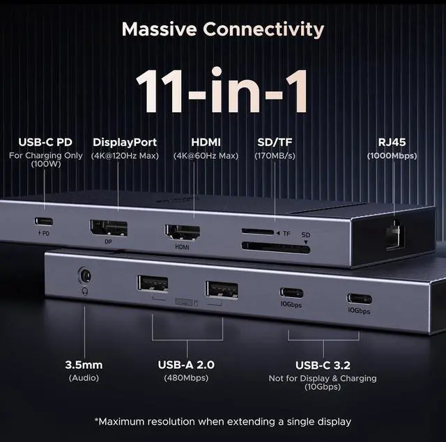 11-in-1 Connectivity: The Revodok Pro Docking Station is designed to optimize productivity for modern professionals. It featurs a 4K@120Hz DisplayPort, a 4K HDMI, a 100W USB-C PD input, two 10Gbps USB-C data ports, two USB-A data ports, a RJ45, an AUX port and SD/TF card slots
