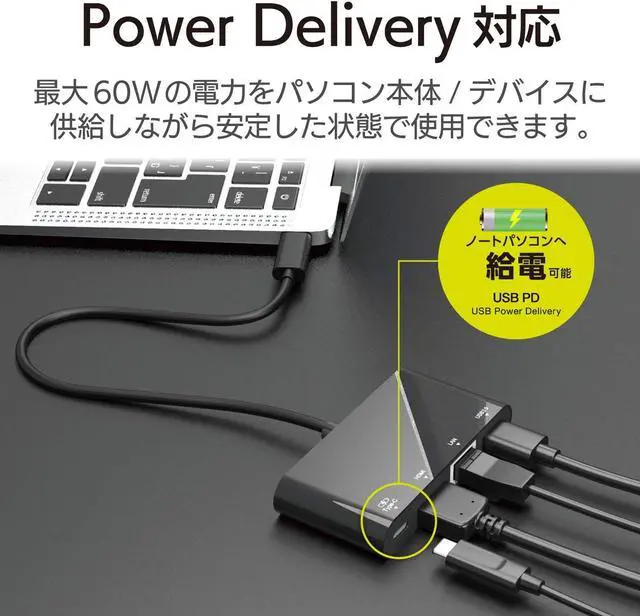 It is compatible with USB Power Delivery that provides a maximum of 60W (*) power to your device/PC unit via the Type-C (TM) connector