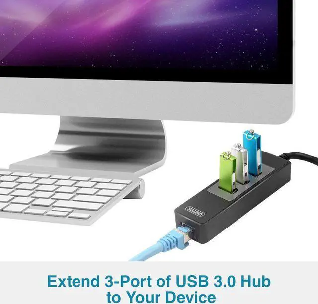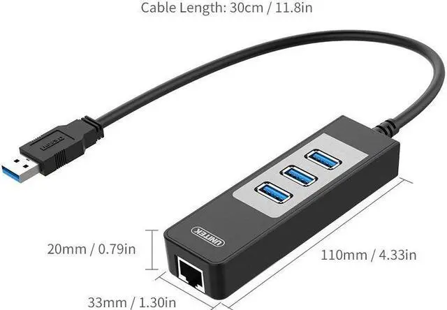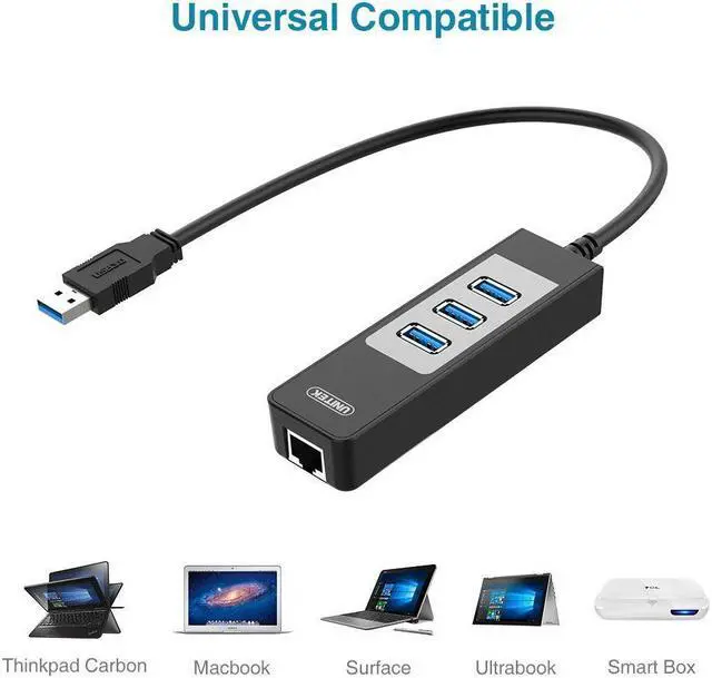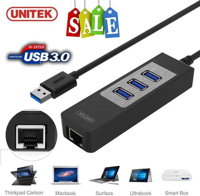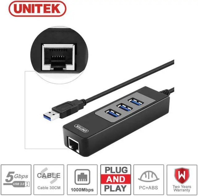 UNITEK Universal USB 3.0 SuperSpeed 3-Port Hub with LAN Network Adapter not only adds three USB 3.0 ports to your laptop or desktop, but also allows you to connect your device directly to your network via USB port. Fast USB 3.0 and Gigabit solution This Ethernet Adapter supports 10/100/1000Mbps for high-speed connectivity, important for file sharing, downloads, streaming, web videos, and more. Computers limited to 10/100Mbps Ethernet will experience faster transfers when plugged into a Gigabit Ethernet network using this Ethernet adapter. Use this Ethernet adapter to participate on multiple networks, replace damaged Ethernet ports, add a physical network connection to wireless-only systems, and replace network cards.