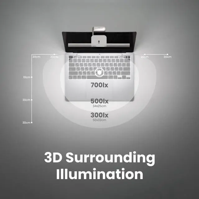 IMMERSIVE 3D SURROUNDING ILLUMINATION LaptopBar's 3D illumination, crafted from 20 million simulations, ensures ideal laptop lighting, minimizing contrast for a comfortable workspace.