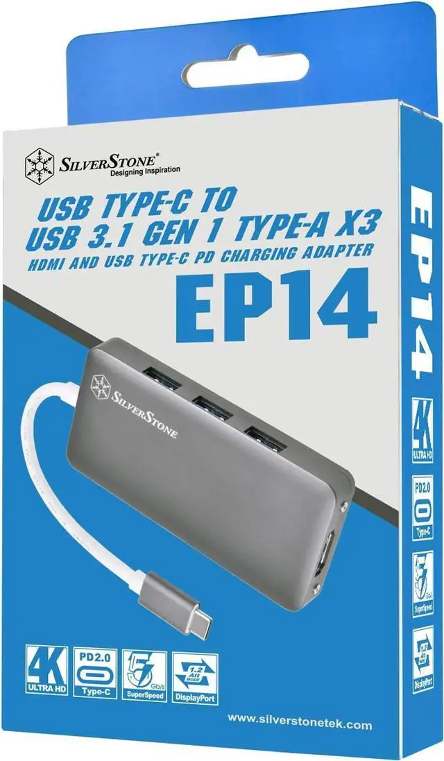 Silverstone SST-EP14C - USB 3.1 Type-C Gen1 to HDMI (res. up to 4096 x 2160 @ 30Hz), 3X USB 3.1 Gen 1 Type-A, 1x USB 3.1 Gen 1 Type-C (PD 2.0 Charging), Charcoal