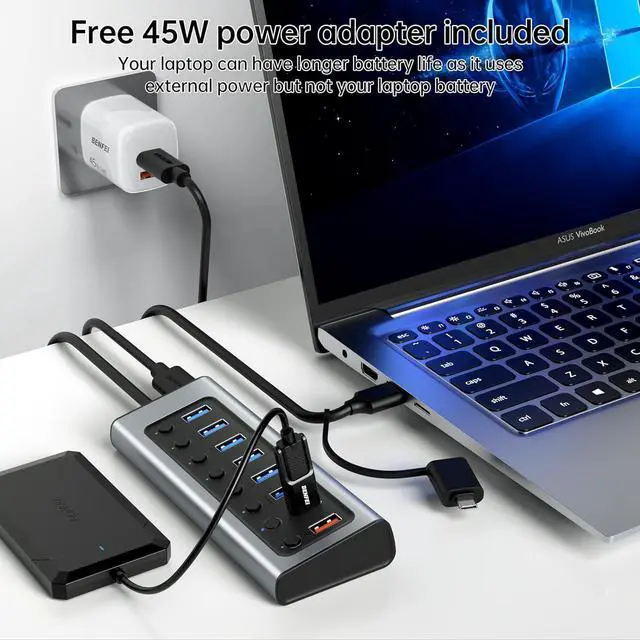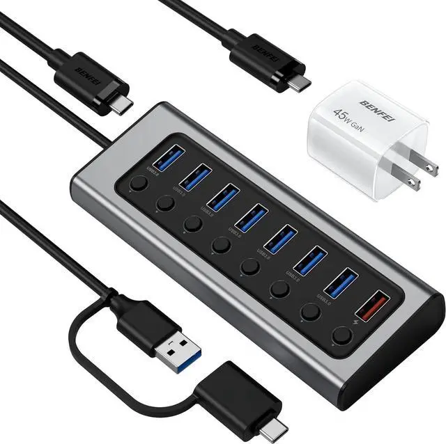 Instant USB 3.0 Port Expansion & SuperSpeed Syncing: With 4 Feet Hybrid USB-C USB-A cable, BENFEI 7 ports USB Hub instantly expands 1 port to 7 external USB 3.0 data ports for keyboard, mouse, printer, hard drivers, USB Flash drive and more USB devices. Synchronizing data at speeds up to 5Gbps, this powered USB 3.0 hub can transfer files and data in a flash.
