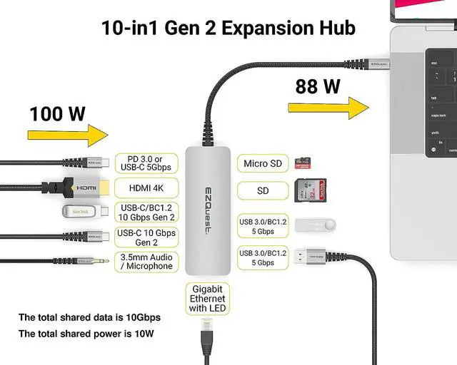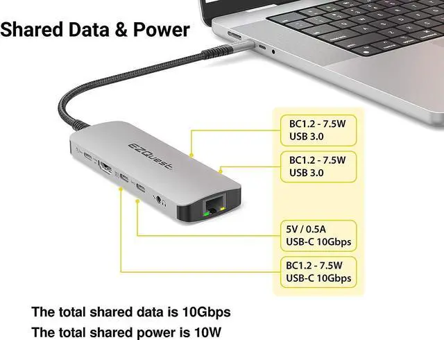 [POWER OUTPUT] Stay powered up with versatile charging options. This USB C multiport adapter offers 2 x USB-C Gen 2 ports, with one providing BC1.2 support for a power output of 5V/1.5A (7.5W), and the second USB-C port providing 5V/0.5A (2.5W) power output. Additionally, there are 2 x USB-A 3.0 ports with BC1.2 support, each offering a power output of 5V/1.5A (7.5W). The total shared power output is 10 Watts, ensuring efficient and reliable operation of multiple devices at once.