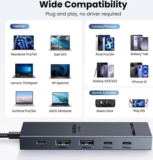 UGREEN Revodok USB-C Hub 6 in 1 10Gbps USB C 3.2 & USB-A 3.2 4K 60Hz HDMI, 100W Power Delivery for MacBook Pro/Air, iPad Pro, Thinkpad Rog Ally and More.