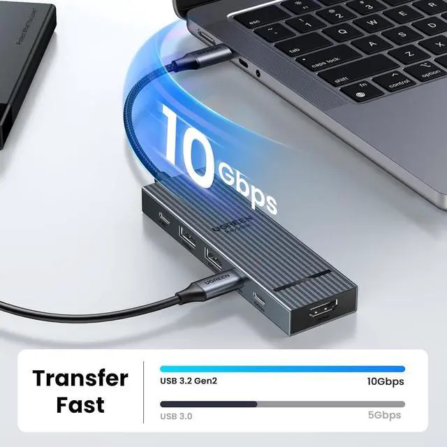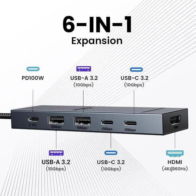6-in-1 10Gbps USB C Hub: Inspire more potential of your laptops USB-C port with two 10 Gbps USB-C 3.2 Gen 2 port, two 10 Gbps USB-A 3.2 Gen 2 ports, 4K 60Hz HDMI and 100W Power Delivery.