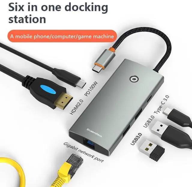 6 in 1 Interface: USB3.0*2 +USBC*1+4K60HZ HD+100W PD