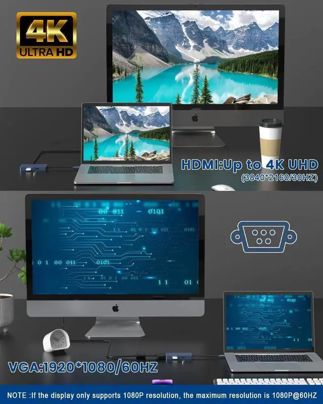 [Ultra HD 4K Output]: HDMI adapter supports up to 4K resolution video at 30Hz, and 1920x1080 (1080p) at 60Hz stream 4K UHD or full HD 1080P video to HDTV, monitors, or projectors to enjoy a cinema-like visual feast. Note: HDMI and VGA at the same time. They are the same signal source and can only display the same picture with a maximum resolution of 1080p.