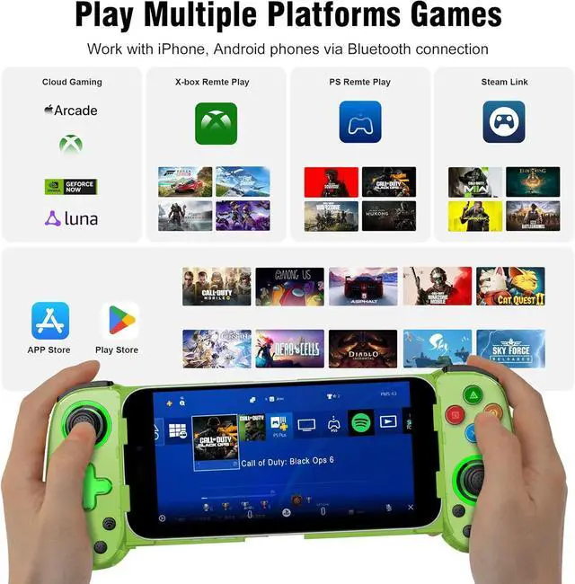Multi-Platform Support: Play any controller supported APP games, and the controller for iPhone & Android is designed to enjoy unstoppable gaming experience, support nearly all cloud gaming services including Game Pass, PS Remote Play, Steam Link, GeForce NOW, MFi Arcade & hundreds of popular mobile games like COD, Genshin Impact, etc.