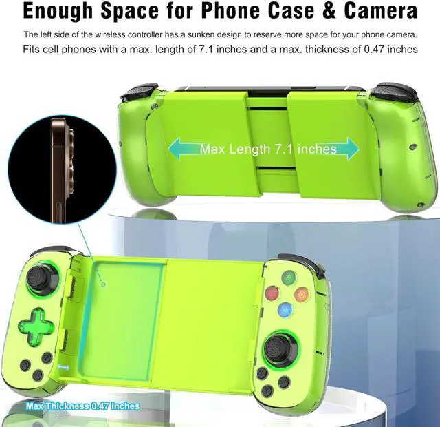 Universal Compatibility: The phone gaming controller works seamlessly with iPhone & Android phones, including iOS 15+/Android 10+; Completely suitable for the full range of iPhone 17/16/15/14/13 and so on; Bluetooth controller for android is compatible with Galaxy S series, Galaxy A series & more Android smartphones; The scalability of controller for phone allows you to install a 127-180 mm cellphone, don't have to remove your phone case every time