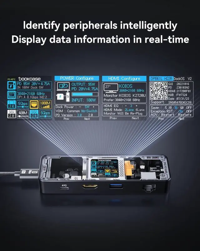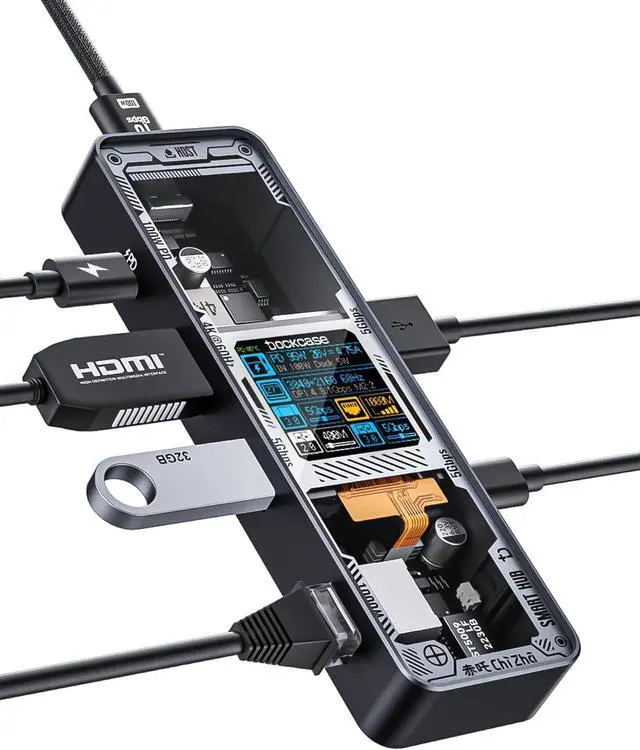 Dockcase Explorer Edition: Smart USB-C Hub 6-in-1, the perfect hub solution that combines functionality with style. With its sleek design, Dockcase stands out from the rest. Its commonly used interfaces meet your daily needs and the display and D-Key function control allows for customization of usage, giving you the power to take on even the most demanding tasks. Whether for work or play, Dockcase delivers a significant boost in performance, making it the perfect addition to your setup.