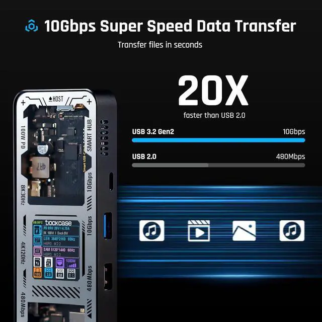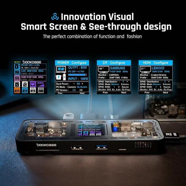 Dockcase Smart USB-C Hub: 10-in-1 Explorer Edition, the ultimate smart hub for your workspace. Adjustable function display combined with versatile ports and connections, you can easily expand your laptop or desktop computer into a complete workstation.