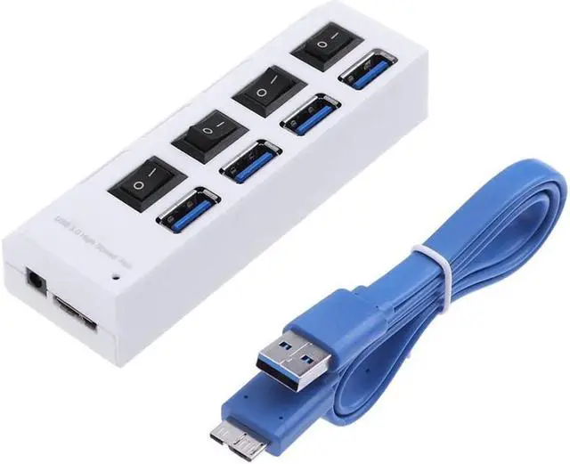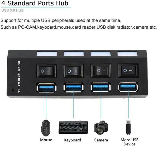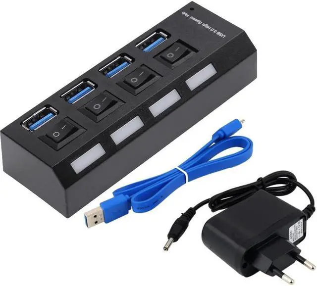 DescriptionOverview :This 4 ports 3.0 hub adds super high speed ports to your computer easily. Its fine texture and compact appearance makes it suitable for different occasions.Every port of it gets a indicate light and switch around, which makes it convenient for you to know and control the working condition of all ports. With highest speed of 5G/S, the hub can be compatible with Win 8.1, Win 8, MAC and so on.Features :Compatible with your Windows, Mac OS or Linux systems.1 upstream and 4 downstream port.4-port 3.0 hub with super speed transfer rate up to 5Gbps.Backwards compatible with 2.0 & 1.1.Supports hot swap.Built-in over-current protection to protect both connected devices and the hub itself from unforeseen power surges.Plug and Play, no driver needed. Light weight, small size, easy to carry.Specifications :Color: BlackMaterial: ABS Ports: 4 type: 3.0Compliant with version :1.0 - 1.5Mbps (Low-Speed)1.1 - 12Mbps (Full-Speed)2.0 - 480Mbps (High-Speed)3.0 - 5Gbps (Super-Speed)Compatible Systems: Windows 10 / 2000/ XP/ Vista/ 7/8/8.1/ Linux/ Mac OS 10. X or abovePackage Include :1 x 4 port 3.0 hub1 x 3.0 cableor1 x Power Adapter1 x 4 port 3.0 hub1 x 3.0 cable