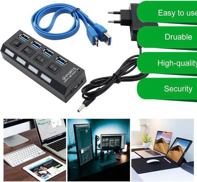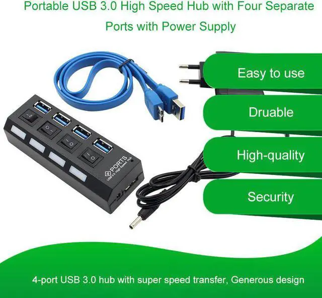 USB 3.0 High Speed Hub with Separate Four Ports Compact Lightweight Power Adapter Hub with Power Supply