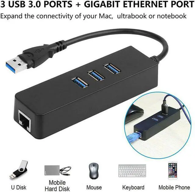 65869HOT SALES FOR YOU Features: 1.2 in 1 dual function: three USB 3.0 ports and one 10/100 / 1000M Gigat Ethernet adapter 2. Fast and stable: These USB 3.0 ports can increase the transmission speed to 5Gbps (or 10 times faster than USB 2.0); Gigat Ethernet can achieve 1000 Mbps running speed, providing faster and more stable than Wi-Fi connection. 3. Support 10/100/1000 Mbps auto sensing function. 4. USB 3.0 interface: backward compatible with USB 2.0. 5. Support Auto MDIX (straight through and cross network cable automatically detect ions. 6. Support USS full speed and high speed mode with bus power capality IEEE 802.3, 802.3u and 802.3ab (10 Base-T, 10OBase-TX and 1OOOBase-T.) are compatible. 7. Support full-duplex and half-duplex operation in Fast Ethernet 8. Plug and Play installation: Comply with USB3.0, 2.0 and 1.1 specifications. 9. System requirements: Windows XP / Vista or Windows 7 or Windows 8 8.1 or Windows 10 or Macintosh OSX 10.6 / 10.7 / 10.8 and higher.