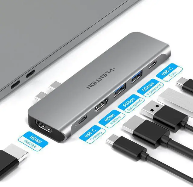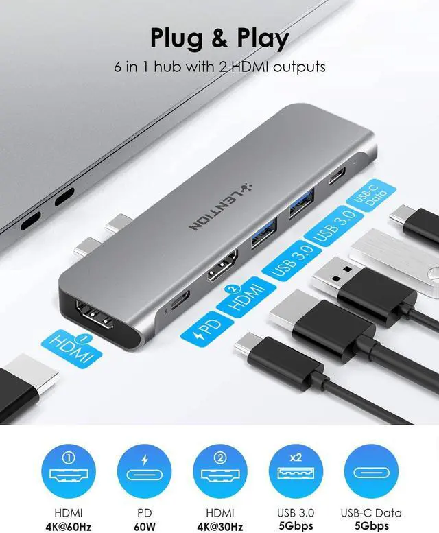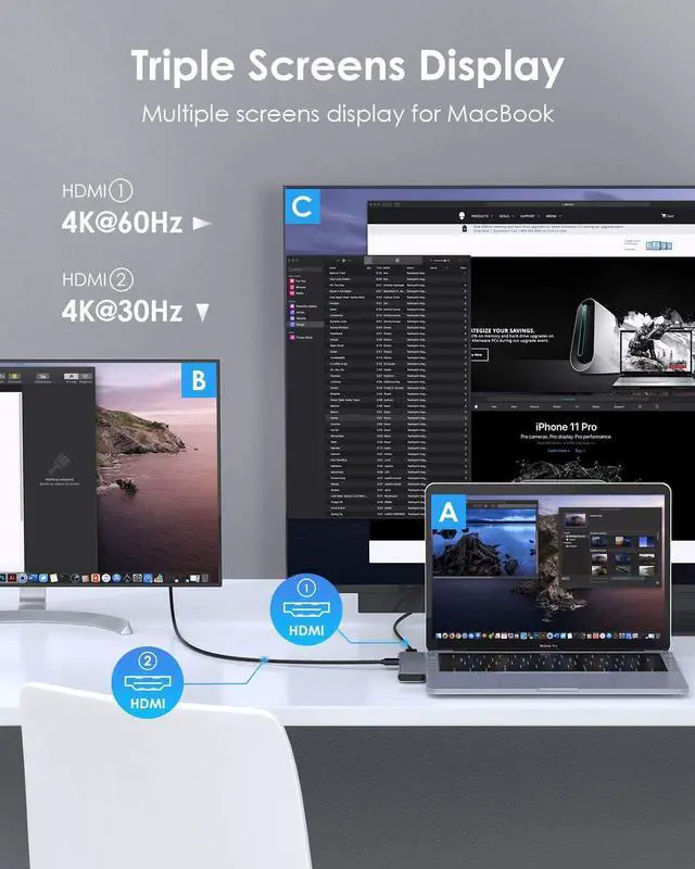 Triple Screens Display: supports multiple screens display for New MacBook Air/Pro. With 2 HDMI outputs, one HDMI port supports 4K@60Hz, another supports 4K@30Hz. When you connect 2 screens it supports MST (Multiple Stream Tranport, two external screens with different output)