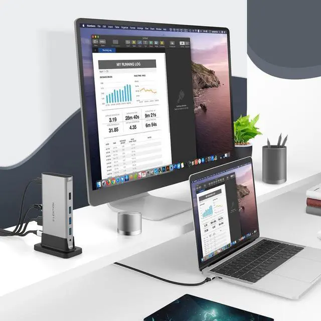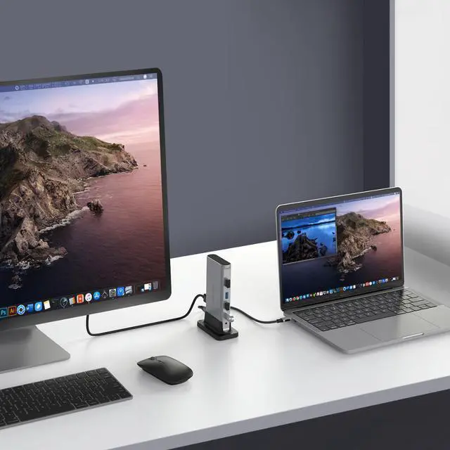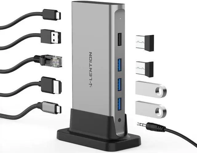 1All in One - The docking station provides 3 USB 3.0, Gigat Ethernet, /Micro Card Reader, Power Delivery, 4K HDMI & 1080P VGA that displays duplicated screen when both in use (single-stream transport), and Aux output that works together with HDMI or VGA