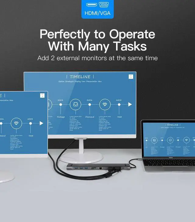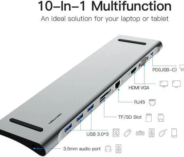 Specification:Applicable models: For MacBook Pro 2017 (13"& 15") For MacBook Pro 2016 (13"& 15") For MacBook 2015/2016 For ChromeBook Pixel Laptop Computers Complying with USB-C Interface Input interface: 1*HDMI interface 1*VGA interface 3*USB 3.0 Interface 1*RJ45 interface 1*3.5mm Audio Interface 1*Memory Card Interface 1*TF Card Interface 1*Mini DP interface Output: Type-C Network Interface: Gigat Video resolution: HDMI: 4K (3840*2160), 30Hz downward compatible VGA: 1920*1080, 60Hz downward compatility Working Voltage: 5V~20V Working temperature: 0~45 Material: alloy