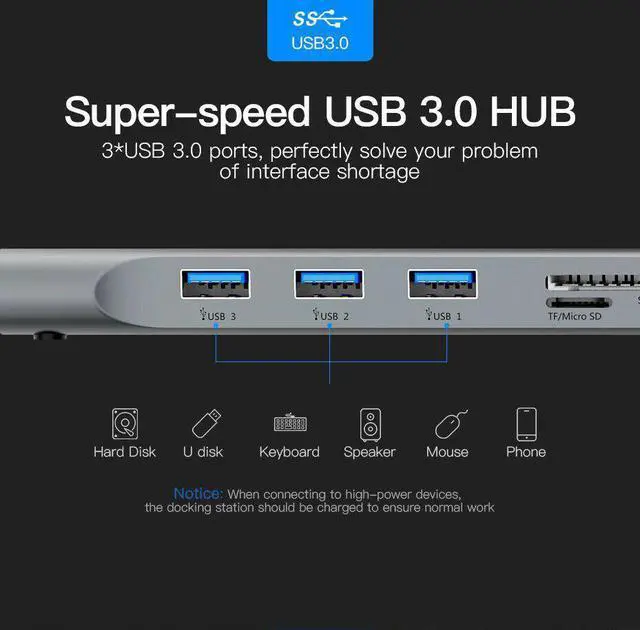 Feature:1. Three high-speed USB 3.0 interfaces, transmission speed up to 5 Gbps, movies, large files easy transmission, reduce waiting time. 2. HDMI interface has a resolution of up to 1080P, which is as clear and smooth as cinema. 3. Type-c flash charge, 60W high power, to meet the expansion of external multi-device use, can provide 20V/3A notebook with strong power supply capacity. 4. Independent audio port design, support earphone and microphone audio output, solve the problems of listening, recording, voice calls, etc. 5. Add Memory Card/TF card socket. Solve the problem for MacBook/Super-pole card reading without card slot, read at high speed, and make processing more efficient. 6. Integral aluminium alloy shell, fine sandblasted aluminium alloy material, corrosion resistance, easy to heat dissipation, scratch resistance, integral partition molding, higher strength, more durable. 7. Silicone anti-skid pads are designed at the top and bottom to ensure that the notebook body is stable in use. 8. Applicable to a variety of scenarios, extended for MacBook and other ULTRA-BASIC multi-interface, multi-screen simultaneous broadcast.