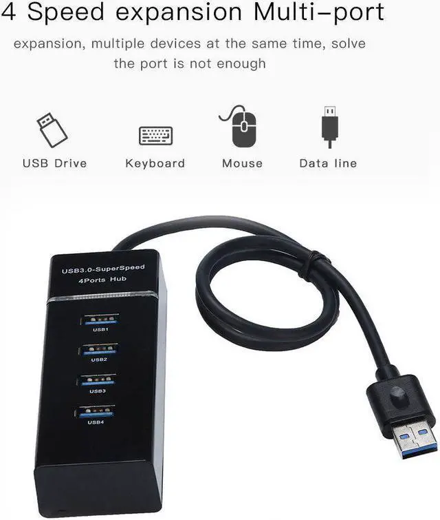 Description: Add more to your computer with this handy 4 port hub and hook up all your favorite gadgets! Multi angles connection makes it easy to access hard-to-reach ports!This 4 ports USB 3.0 hub adds super high speed ports to your computer easily. Its fine texture and compact appearance makes it suitable for different occasions.Every port of it gets a indicate light and switch around, which makes it convenient for you to know and control the working condition of all ports. With highest speed of 5G/S, the hub can be compatible with Win 8.1, Win 8,10, MAC and so on.Features: