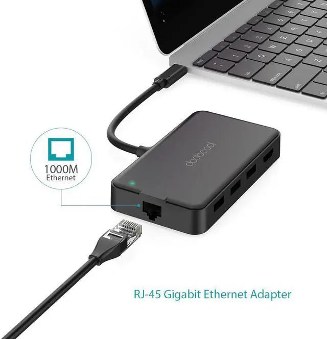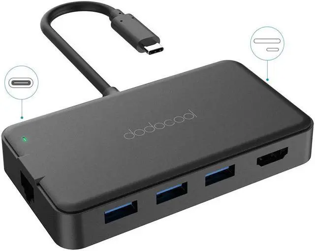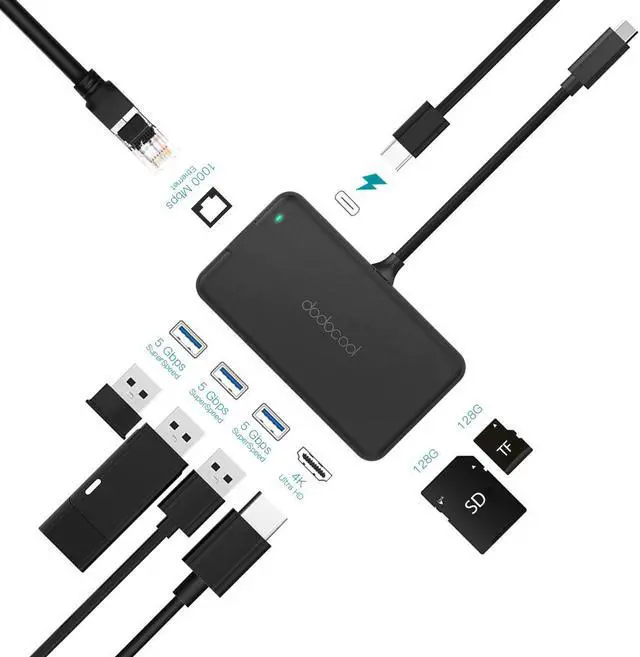 Extend one USB Power Delivery Type-C charging port, one HD output port, three USB 3.0 Type-A ports, one SuperSpeed Gigat Ethernet port, one memory card slot and one TF memory card slot from one USB-C port or Thunderbolt 3 (USB-C) port.