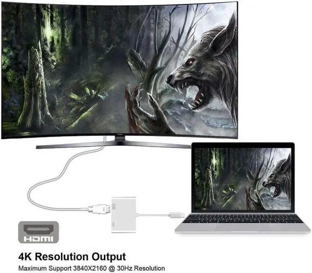 Support 4K Max-USB C to HDMI-compatible VGA Adapter Supports video resolution up to (4K * 2K) at 3840 * 2160P / 30Hz. when use HDMI-compatible alone, It support a large screen liquid crystal TV or display compatible with 4K max output.
