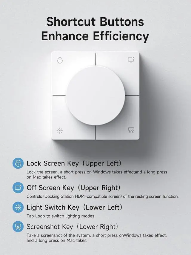 Multifunction Button: Hagibis UC-1102A USB C hub not only expands with nine ports, but also can adjust the volume and mute with a knob, it also has four shortcut buttons to lock the screen, turn off the screen, take a screenshot, and adjust the lighting