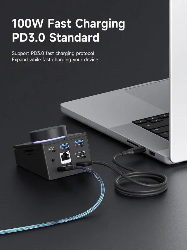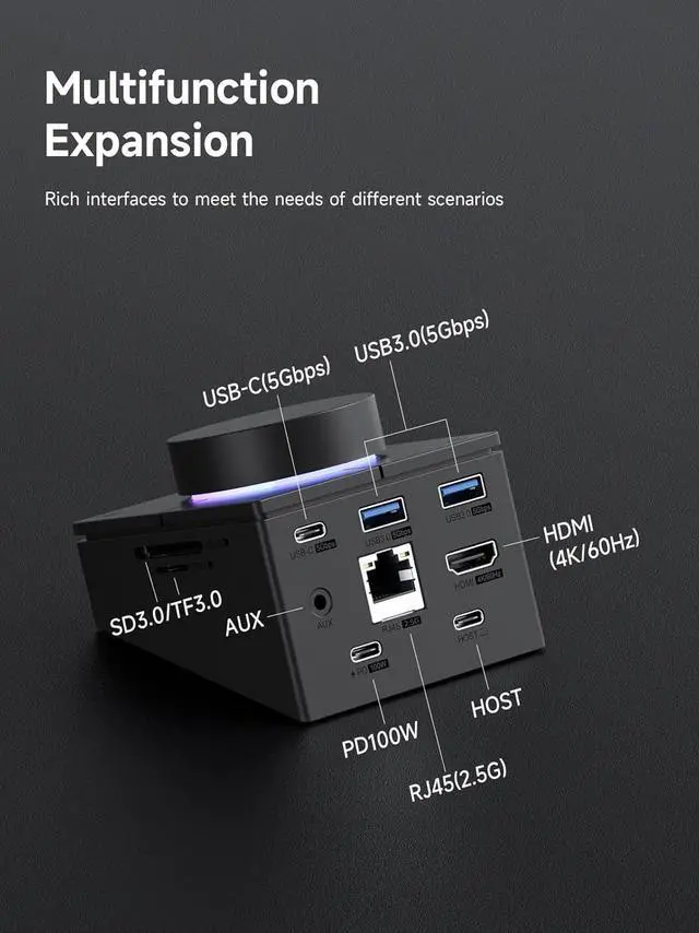 Unique Integrated USB-C Docking Station: Hagibis innovated and developed this multi-function USB C Hub, which integrates 9-in-1docking station & RGB Light & Volume Knob & Shortcut Buttons, make your docking station different from the rest, add color to your desktop