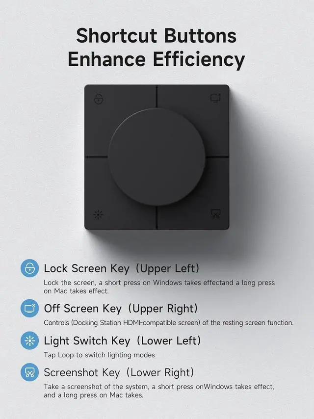 Multifunction Button: Hagibis UC-1102A USB C hub not only expands with nine ports, but also can adjust the volume and mute with a knob, it also has four shortcut buttons to lock the screen, turn off the screen, take a screenshot, and adjust the lighting