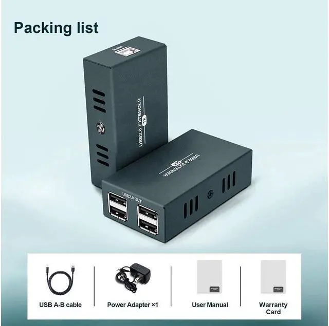 USB 2.0 Extender 165ftUSB Extender over single Cat5e/Cat6/Cat7 cable max up 50 meters. Support 4 USB 2.0 ports. USB 2.0 high-speed transmission (up to 480Mbps). Only one power adapter is needed.