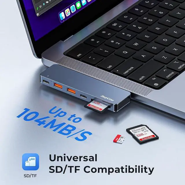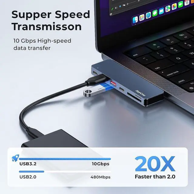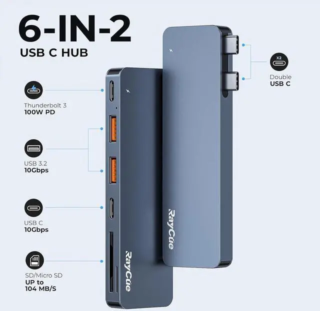 6 IN 2 Multiport Macbook Air/Pro Adapter USB C Adapter for MacBook Pro/Air 13/14/15/162016-2023USB C Hub expand your MacBook Pro/Air into 6 ports for your daily use: 2*10Gbps USB portsThunderbolt3/4ports10Gbps USB C portsSD/TF Card Reader Port.