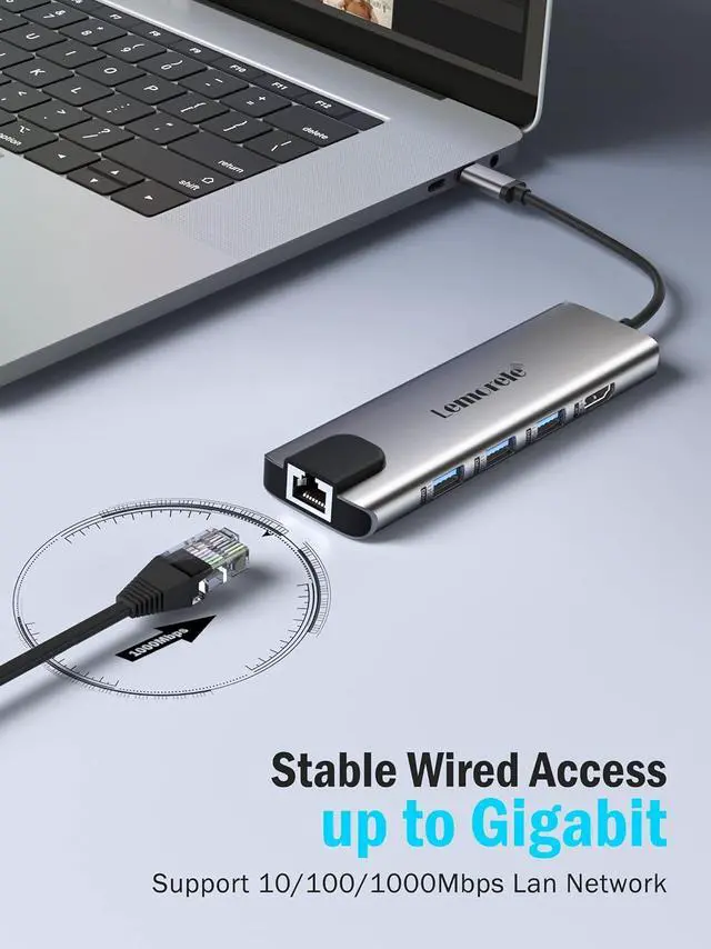 [Gigabit Ethernet Port & High Speed Transfer]: With the max 1000Mbps RJ45 port, Lemorele USB C hub Ethernet ensures a stable and faster wired internet connection. 3 USB-A 2.0 data ports and 1 USB C 2.0 data ports, max data transmission up to 480Mbps, transfer and backup your files in seconds. Built-in SD and micro SD slots for easy access to files from universal SD and micro SD memory cards. Note: Not support 2 cards reading simultaneously.