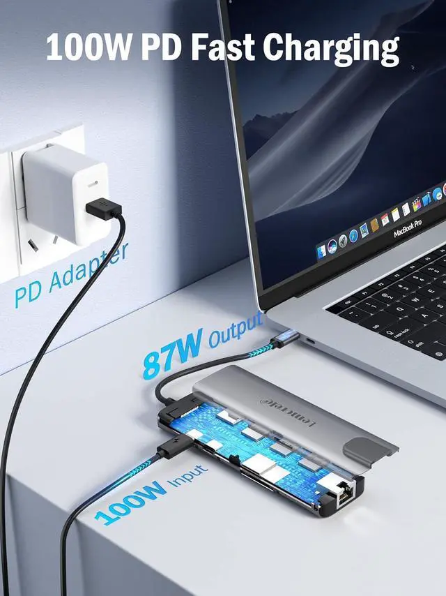 [100W PD Fast Charging]: Lemorele USB C Hub Multiport Adapter supports 100W PD power delivery, power out (charging) is limited to 87W for safety. It is 2x than others to fully charge 16'' MacBook Pro or other compatible laptops (using your devices original power adapter) while youre using all the other functions of the hub.