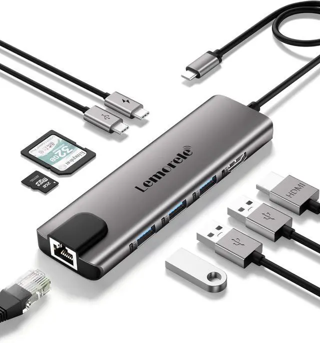 Lemorele USB C Hub Multiport Adapter 9 in 1 w/Gigabit Ethernet, 100W PD, HDMI 4K, 3 USB 2.0, 5Gbps USB C Data Port, SD/TF Card Reader, Dongle Docking Station for MacBook Lenovo HP Dell Laptops