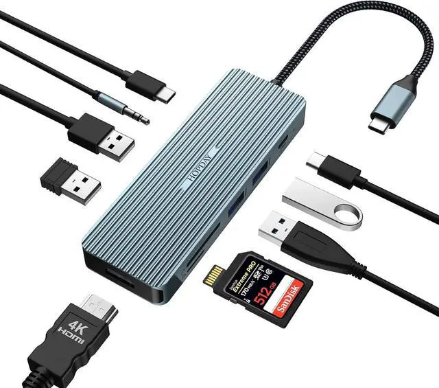 Streamlined and Efficient USB-C HubExperience the convenience and elegance of this 10-in-1 USB C Multiport Laptop Adapter that offers seamless connectivity and a sleek design. With 2 x USB-A 3.0, 2 x USB-A 2.0, 1 x USB-C 3.0, 1 x 4K HDMI, 1 x 100W PD, 1 x audio/mic jack, 1 x SD card reader, and 1 x TF card reader, this plug and play adapter requires no additional software or drivers. Its lightweight and portable design is complemented by a unibody aluminum exterior.