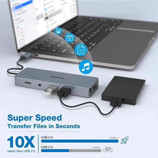 10 in 1 USB-C Hub Plug Play This 10-Port Laptop USB C Multiport Adapter (2 x USB-A 3.0, 2 x USB-A 2.0, 1 x USB-C 3.0, 1 x 4K HDMI, 1 x 100W PD, 1 x audio / mic jack, 1 x SD card reader, 1 x TF card reader). Plug and Play, no additional software and drivers required.