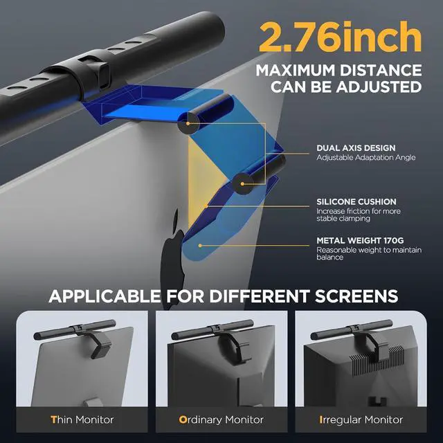 High Compatibility & Space Saving: The 16-inch computer monitor light bar, powered via USB Type-C, compatible with monitors of thicknesses up to 2.76 inches, maximizing desk space efficiency.