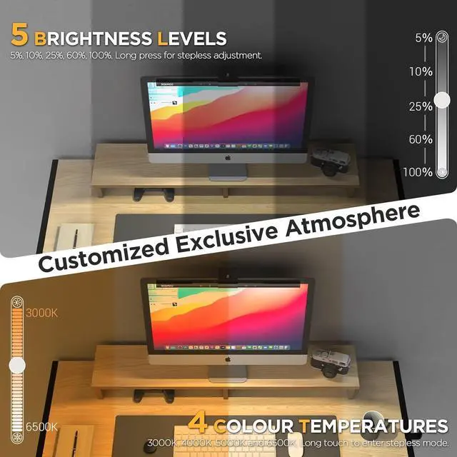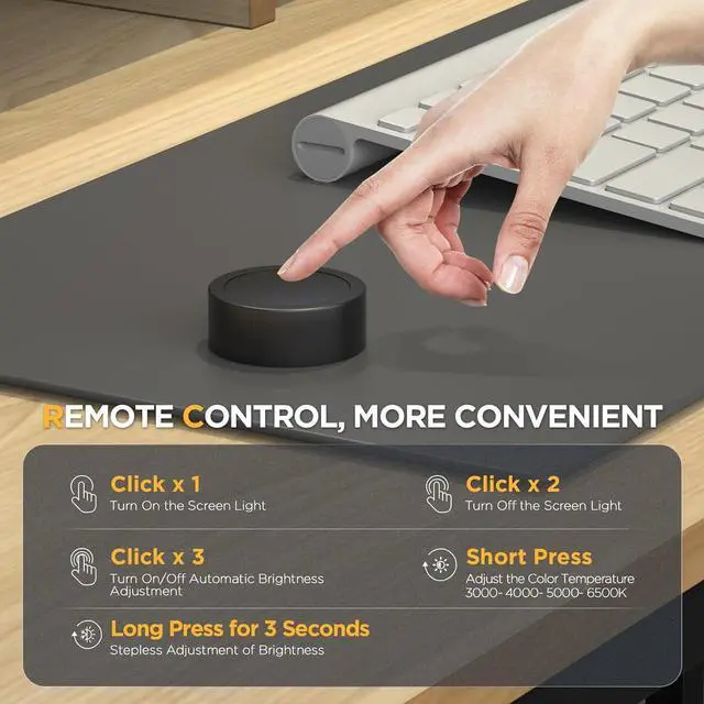 Stepless Dimming via Wireless and Touch Control: The computer light bar features a sensitive remote control that integrates multifunctional controls, allowing you to easily adjust brightness (5%-100%) and color temperature (3000K-6500K) for various scenarios.
