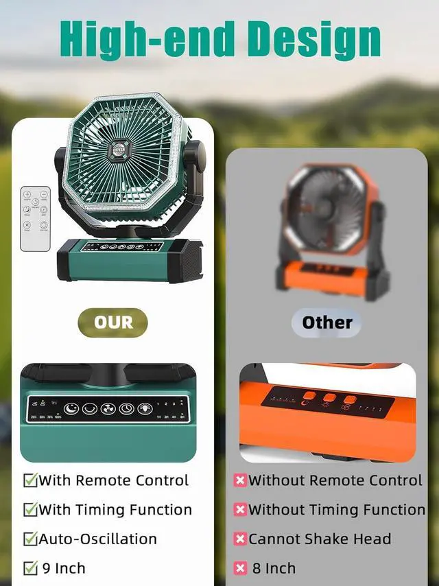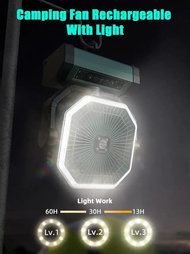 PORTABLE CAMPING FAN WITH Light & Hook: This camping fan battery powered offers 58 LED beads, 3 dimmable brightness functions for different occasions. Great portable fan for bedroom, Office, Camping, RV, Power Outage, Rtc. The 2-in-1 portable outdoor fan has a 360° rotating hidden hook so you can hang the fan up and adjust the right angle. In addition, it is also suitable for use indoors as a large battery operated fan. This would be a great gift for your family and friends.