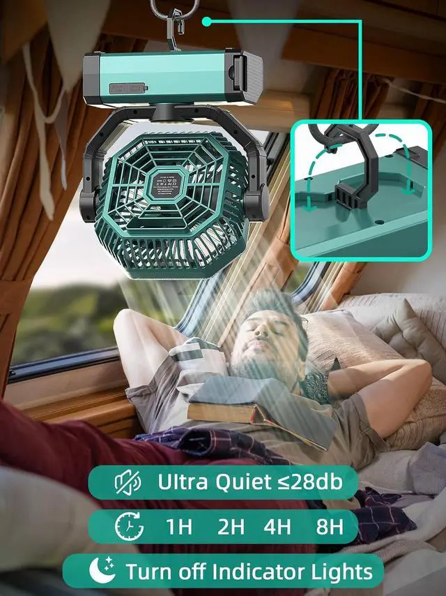 USB FAN CAMPING WITH SLEEP TIMER: This rechargeable camping fan has a sleep timer to help you set the working time, The battery operated fan camping doesn't have to run all day or all night (can be timed to 1H, 2H, 4H, 8H), Also you can set the sleep mode will turn off all the lights to help keep it dark and better sleep, Thanks to its powerful and super quiet feature, This portable battery fan runs with the lowest white noise (<28db) Let you get maximum comfort.