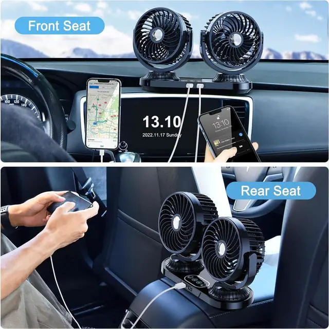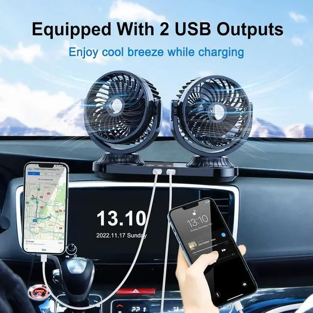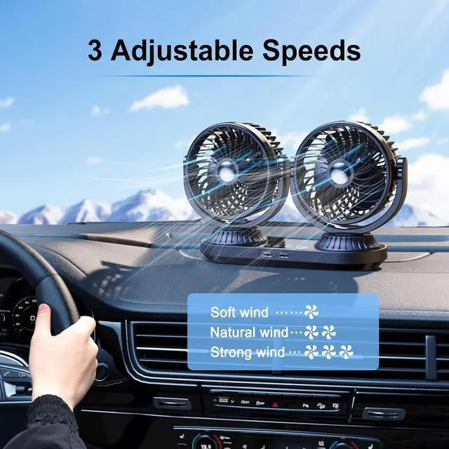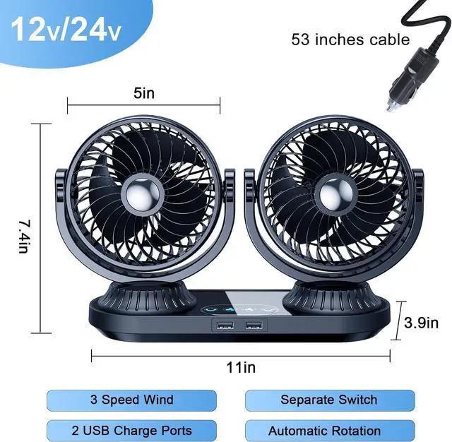 [ 2 USB Port & 3 Speed ]--The 5 inch turbo dual head car fan has 2 USB port and 3 speeds . The 12 volt fan for truck is equipped with 2 USB ports, you can charge your phone or other devices without worrying about the cigarette lighter being occupied. The speed and angle of the rv fan can also be adjusted at will as you like, and it can provide a strong airflow to cool down the car quickly.