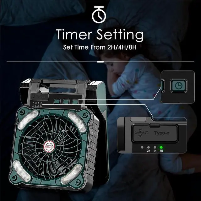 3 Levels Bright LED Light & Timer Setting-- This rechargeable fan covered with 3 brightness LED lighting settings. Perfect for outdoor activities like camping, fishing, and hiking, it provides a soft and non-glaring light that won't strain your eyes. It also has a convenient sleep timer setting to set time from 2h/4h/8h, don't need to run fan all day or all night.